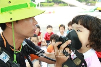 서울 구로소방서(서장 유건철)는 3일 오전 구로구민체육센터를 이용하는 어린이 및 교사 등을 고척근린공원으로 초청해 이동안전체험차량을 활용한 '보고ㆍ듣고ㆍ체험하는 119 안전체험' 현장학습을 실시했다. 사진은 산소마스크를 체험해보는 어린이 모습.