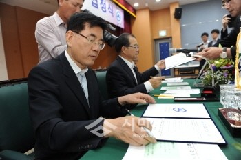서울 동대문구와 충남 청양군이 4일 오전 11시 청양군청 대회의실에서 양 지자체 의원, 유관단체장 등 70여명이 참석한 가운데 자매결연 협정식을 가졌다. 사진은 유덕열 동대문구청장이 협정서에 사인을 하고 있는 모습.