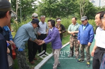 신연희 서울 강남구청장이 4일 오후3시 개포동 1267-1번지에서 열린 ‘강남그린웨이 조성 준공 행사’에 참석해 관계자들을 격려하고 있다. 강남구는 지난 해 공사를 착수해 공원을 조성했다.