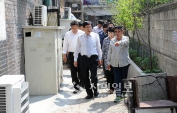 유덕열 서울 동대문구청장(앞줄 왼쪽)과 구청 관계자들이 전농동 620-112 일대 쪽방촌을 둘러보고 있다. 동대문구는 쪽방촌에 거주하는 주민들을 만나 동대문구사회복지협의회에서 마련한 라면 70여 상자를 주민들에게 전달했다.