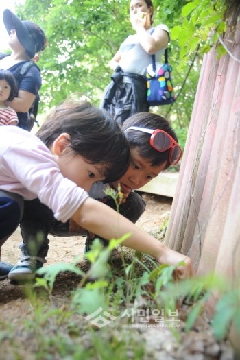 염태영 수원시장을 비롯해 수원시민 1천여 명이 최근 ‘자연과 나는 하나’라는 주제로 광교공원에서 가족 산림체험 행사를 치뤘다. 사진은 두 명의 아이가 생태놀이 체험을 하는 모습.