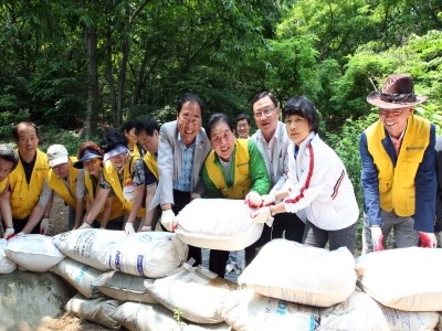 [시민일보]문충실 서울 동작구청장(오른쪽 네 번째)이 최근 사당4동 까치산 배수로에서 사당4동 안전지킴이들과 함께 모래마대를 쌓고 있다. 모래마대는 장대비가 내릴 경우 까치산 정상에서 내려오는 빗물을 막아주는 역할을 하게 된다.