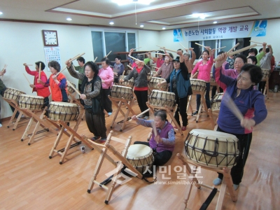 광주시 농업기술센터(소장 김학진)는 노년기 역할 상실에서 오는 노인의 심리사회적인 문제를 해소하고 지역발전에 기여할 수 있는 ‘농촌노인 사회활동 역량개발 시범사업’을 지난 4월부터 오는 11월까지 적극 추진하고 있다. 사진은 능력개발 분야인 '난타' 프로그램에서 노인들이 북을 활기있게 치는 모습.