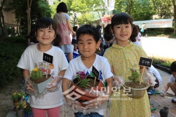 10일 서울 성동구청 앞 광장에서 '서울, 꽃으로 피다' 캠페인이 열려 구립왕십리어린이집 원아들이 재활용 화분에 꽃묘 13종을 심었다. 어린이들이 농구공, 냄비로 만든 화분을 든 채 활짝 웃고 있다.