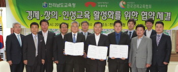 전남교육청(교육감 장만채)은 (사)한국경제교육협회(사무총장 박상득), 창의력학교 아띠(대표 공경용)와 전남지역의 미래 글로벌 인재육성과 저변 확대를 위한 ‘경제·창의·인성교육 활성화’ 협약(MOU)을 10일(월) 도교육청 비즈니스실(5층)에서 가졌다.