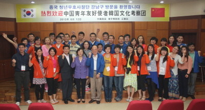 강남구가 12일 오후 3시 삼성동 구립국제교육원에서 강남구의 선진행정을 배우고 강남스타일을 시찰하기 위해 방문한 중한우호협회 중국청년우호사절단 200명을 맞이했다. 사진은 신연희 구청장(앞줄 왼쪽 5번째)이 중국청년우호사절단과 함께 기념촬영하는 모습.