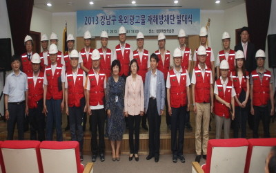 서울 강남구가 14일 오후 3시 청담평생학습관에서 ‘옥외광고물 재해방재단 발대식’을 개최, 이날 위촉된 재해방재단원들이 신연희 강남구청장(앞줄 가운데)와 함께 기념촬영을 하고 있다.