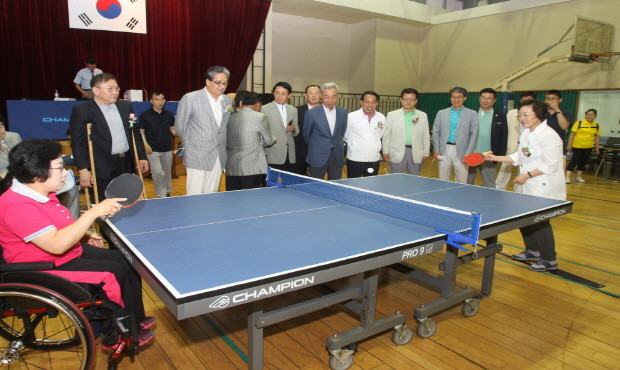 신연희 서울 강남구청장(오른쪽)이 16일 오전 11시 수서동 ‘강남스포츠문화센터’에서 열린 ‘제1회 강남구청장배 장애인 생활체육 탁구대회’에 참석해 대표 선수와 탁구 시범을 선보이고 있다.