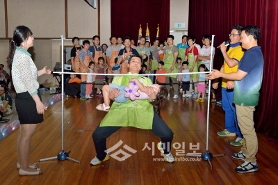 최근 서울 송파구청 대강당에서 '아빠와의 일일 힐링캠프-아빠하고 나하고' 행사가 열렸다. 이 행사에 참가자 400명이 참가해 가족 단합을 과시했다. 참가자가 아이를 안은 채 림보에 도전하고 있는 모습.