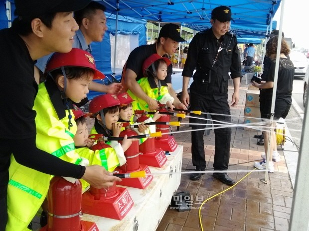 최근 오산시 오산 맑음터 공원 에코리움 광장에서 ‘행복을 부르는 어린이 안전체험학교’행사를 개최했다. 사진은 아이들이 소화기 사용법을 직접 체험하는 모습.