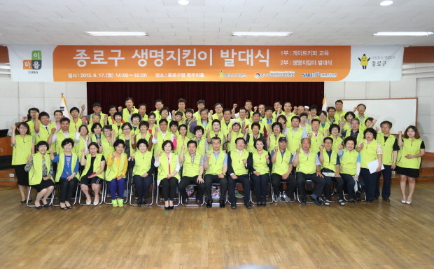 서울 종로구가 지난 17일 통장 260명을 자살예방 '게이트키퍼'로 위촉하고 관련 교육을 실시했다. 김영종 종로구청장, 김복동 종로구의장, 이숙연·강민경·경점순 구의원이 주민들과 파이팅을 외치고 있다.