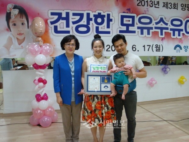 지난 17일 양평군은 보건소건강증진실에서 ‘제3회 모유수유아 건강한 아기 선발대회’를 가졌다. 사진은 최우수상을 받은 강호빈(만3개월)가족의 모습.