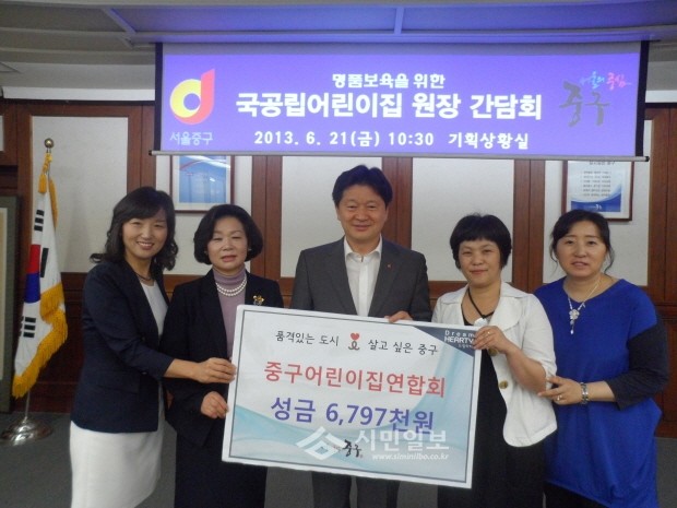 울 중구어린이집연합회가 21일 오전 구청 기획상황실을 방문해 지난 5월 충무아트홀에서 연 어린이날 기념 대축제 바자회 수익금 670만원을 중구 드림하티 사업 후원금으로 전달했다. 사진은 기념촬영 모습.