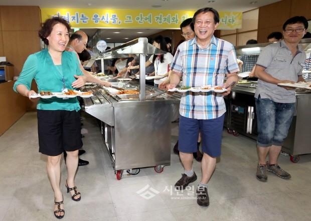 반바지 차림의 차성수 서울 금천구청장(가운데 남성)이 지난 5일 구청 구내식당에서 식사 준비를 하고 있다. 금천구는 이날 '쿨비즈 입기 캠페인'을 개최하고 직원들에게 시원한 복장을 차려입도록 권장했다.