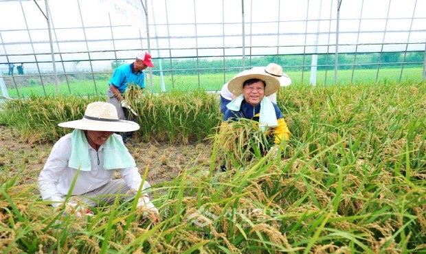 [시민일보]5일 경기 여주군 여주읍 우만리의 한 농가에서 대왕님표 여주쌀 올해 첫 벼베기 행사가 열렸다. 김춘석 여주군수(오른쪽)가 벼베기를 하며 환히 웃고 있는 모습.