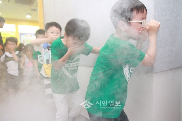 [시민일보]구로소방서는 8일 구로구 개봉2동 <목양몬테소리어린이집> 원생 및 지도교사를 대상으로 본서 소방안전체험교실로 초청하여 ‘우리는 꼬꼬마 소방대장’ 체험학습을 운영했다. ‘우리는 꼬꼬마 소방대장’ 체험 프로그램은, 어린이들의 자기 보호능력 향상은 물론 안전을 생활화하는 풍토를 조성하여 유사시 재난대처능력을 증진하기 위한 프로그램이다. 사진은 아이들이 화재시 유독가스체험하는 모습.