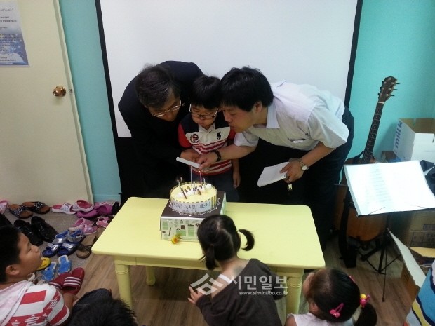 지난 6일 도봉구(구청장 이동진) 창동 신창아파트에서 어린이와 주민들을 위한 ‘어울림’독서방 개관식이 열렸다.사진은 독서방 개관과 신창아파트 입주 15년을 기념하는 케이크 커팅식의 모습.