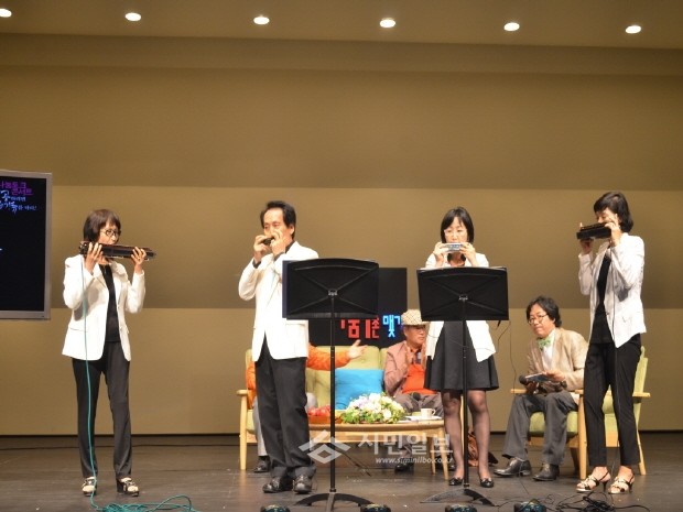 지난 9일 고양시는 고양어울림 별모래극장에서 고양시민 복지나눔 1촌 맺기 선포 2주년을 맞아 ‘성공하려면 상승기류를 타라’라는 주제로 용혜원 시인과 함께 ‘나눔토크 콘서트’가 열렸다. 사진은 콘서트중 열린 하모니카 연주중인 모습.