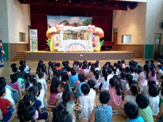지난 5일 구리시(시장 박영순)는 23일까지 6회에걸쳐 건원초교 등 지역내 초등학교 강당에서 저학년 1100명을 대상으로 올바른 식습관 형성과 식품안전에 대한 예방교육 인형극인 ‘꺼꾸리의 음식나라 여행’ 공연을 실시한다. 사진은 공연중인 모습.