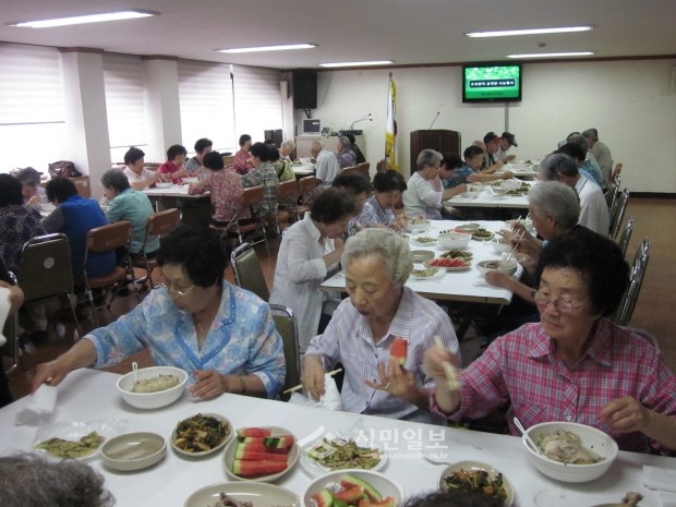 인천 계산3동통장협의회(회장 소병명)는 지난 11일 지역내 노인 60여 명을 동 주민센터로 초청하여 노인들이 더운 여름을 건강하게 지내실 수 있도록 초복맞이 삼계탕 나눔 행사를 실시했다. 사진은 노인들이 동 주민센터에서 삼계탕을 먹고있는 모습.