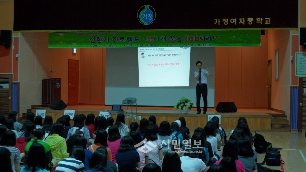 인천서부교육지원청(교육장 안용섭)은 지난 13일 서부 지역내 30개 중학교의 여학생 160명을 대상으로 가정여자중학교(주관교, 교장 장인섭)에서 ‘무지개 꿈을 job아라’라는 전환기 진로캠프를 실시했다. 사진은 강당에서 강사가 학생들을 대상으로 강의하는 모습.