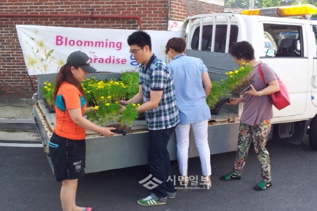 [시민일보] 경기 용인시 처인구 양지면은 올해 주요 사업으로 추진하는 ‘꽃피는 천국 양지 만들기(Bloomming Paradise 양지)’를 위해 16일 꽃 나눠주기 행사를 개최했다. 사진은 주민들에게 꽃을 나누어주고있는 모습.