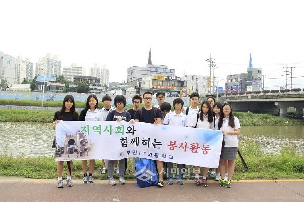 최근 경기 의정부 경민IT고등학교는 의정부시자원봉사센터와 연계하여 경민IT고등학교 전교생을 대상으로 자원봉사 기본교육 및 환경정화 활동을 펼쳤다. 사진은 봉사활동에 참가한 학생들의 모습.