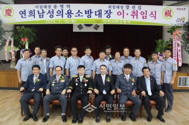 18일 경기 인천서부소방서 3층 대강당에서 소방공무원 및 의용소방대원들이 참석해 연희남성의용소방대 송병억 대장 이임식과 장선길 대장 취임식을 가졌다.사진은 송병억 인천서부소방서 연희남성의용소방대장, 장선길 인천서부소방서 연희남성의용소방대장(오른쪽 두번째와 세번째)과 이임식에 참가한 사람들의 모습.