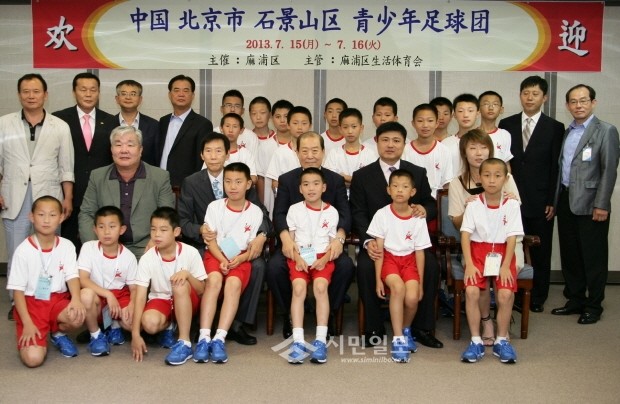 [시민일보]지난 15~16일 마포구는 자매도시인 중국 북경시 석경산구 청소년축구단을 초청, 지역내 청소년 축구단원들과 친선축구 경기를 가졌다. 사진은 석경산구 청소년 축구단과 인사를 나누는 박홍섭 구청장의 모습.