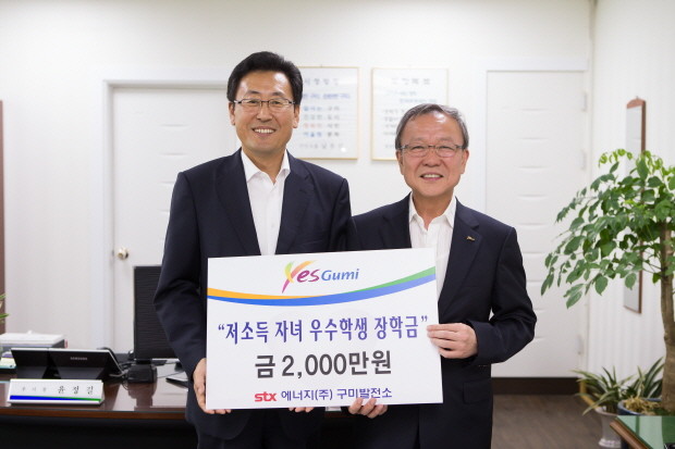 [시민일보]STX에너지(주) 구미발전소에서는 7월 16일(화) 구미시를 방문, 생활이 어려운 저소득층 자녀들중 학업성적이 우수한 총 38명의 학생들을 선정해 대학생 100만원(2명), 고등학생 50만원(36명) 총 2000만원을 전달하였다. 사진은 주경석 발전본부장(좌)이 윤정길 구미부시장(우)에게 2000만원의 장학증서를 전달하고있다.