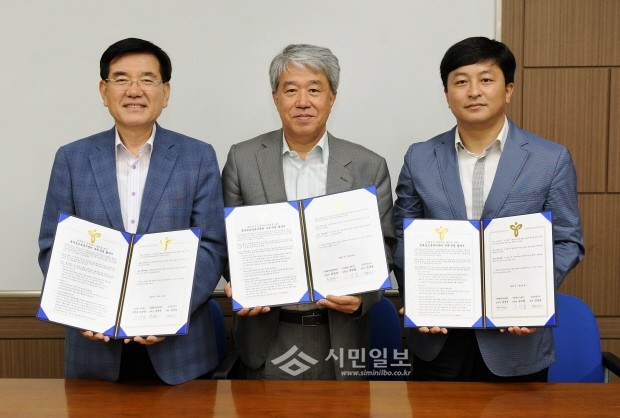 동대문구청은 지난 18일 동부교육지원청 1층 샘터에서 '동대문 교육복지센터 협약식'을 가졌다. 사진은 유덕열 동대문구청장(왼쪽)과 문중근 동부교육지원청 교육장(가운데), 김용길 장안종합사회복지관 관장과 함께 협약식을 마치고 기념촬영을 하고있는 모습.