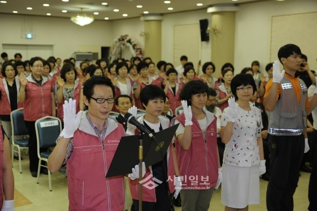 지난 18일 중랑구는 지역주민들이 함께 나서 자살에 대한 해결방안을 찾고 자살문제로 고민하는 이웃들을 돕고자 자살예방지킴이 100여명이 참석한 가운데 자살예방지킴이 발대식이 개최되었다. 사진은 발대식서 선서하는 모습.