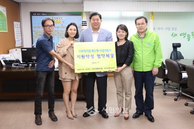 [시민일보]지난 19일 영등포구(구청장 조길형)가 혁신형 사업에 참가하고있는 3개의 사회적 기업과 사업 지원을 위한 협약을 맺고 기념촬영을 하고 있다. 사진은 협약식을 맺고있는 모습.