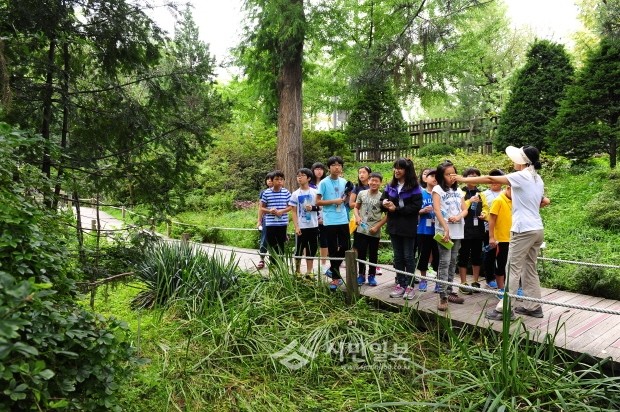 동대문구는 23일 산림청 국립산림과학원과 공동으로 기후변화와 산림의 역할에 대한 아카데미를 개설해 동대문구 초등학교 학생과 학부모 80여명이 국립산림과학원 전문가의 강의를 수강하게 된다. 사진은 산림아카데미 참석자들이 숲체험을 하고 있는 모습.