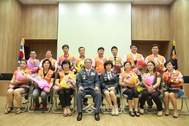 서울 구로소방서는 22일 오후 2시, 구로구 고척1동 소재 본서 3층 대강당에서 신규대원 17명에 대한 임명장 수여 및 공로패 수여에 이어서 정기 교육·훈련을 실시했다.사진은 강인덕 의용소방서대장과 김상임 여성대장(가운데)이 수여자들과 기념촬영 하는 모습.