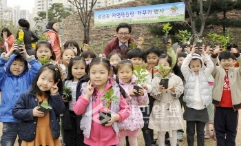 | ▲ 광진구는 '품격 있는 도시, 살기 좋은 광진'을 만들기에 매진하고 있다. 사진은 2013년 4월 23일 진행된 광장동 자연학습장 가꾸기 행사에 참여한 김기동 구청장과 아이들이 기념촬영하는 모습. | ||