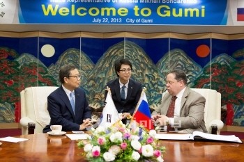 | ▲ 구미시를 방문한 미하일 본다레코 주한 러시아대표부 대표가 남유진 구미시장과 경제교류 활성화 등에 대해 논의하고 있다. | ||