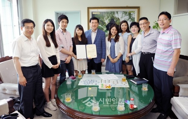 서울 동대문구는 24일 구청장실에서 재능기부를 통한 전통시장 활성화를위해 힘쓴 서울시립대 동아리 인액터스(ENACTUS) 소속 대학생들에게 표창장을 수여했다. 사진은 유덕열 동대문구청장(가운데)이 인액터스(ENACTUS) 소속 대학생들에게 표창장을 수여하고 기념촬영을 하고 있는 모습.
