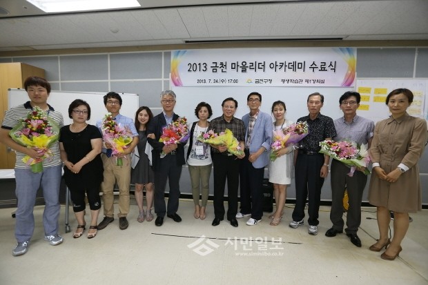 24일 금천구 금천평생학습관에서 열린 마을리더 아카데미 수료식이 열렸다. 사진은 수료식 후 차성수 구청장과 직원들에게 감사 꽃다발을 전한 수강생들의 모습.