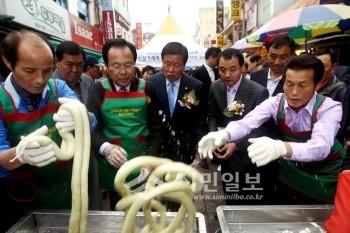 | ▲ 시는 축제 중 요리경연대회를 통해 지역의 대표 먹거리를 확대할 계획이다. 사진은 관계자들이 음식문화축제에서 가래떡을 뽑아 던지는 모습. | ||