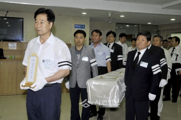 [시민일보]서울 서대문구(구청장 문석진)가 지난 29일 홍은동 동신병원에서 한국에 연고가 없는 우즈베키스탄 고려인 치엔(CHJEN) 씨를 위한 마을장례를 치러 눈길을 모았다. 사진은 서대문구 마을장례지원단 '두레' 가 발인하고있는 모습