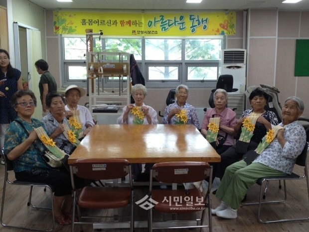 안성시 보건소는 7월부터 8월말까지 집중적으로 홀몸노인 등 건강 취약계층의 가정을 방문간호사 6명이 직접 찾아가 건강관리를 실시한다. 사진은 건강체크후 실시한 공작시간에서 만든 작품을 들고있는 노인들의 모습.