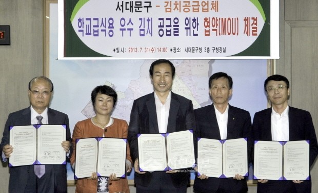 [시민일보]지난 31일 서울 서대문구는 초·중·고등학교 급식에 위생적이고 품질 좋은 국산 김치를 안정적으로 공급하기위해 ‘학교급식용 우수 김치 공급 협약’을 채결했다. 사진은 서대문구와 4개업체 대표가 협약식 후 기념사진을 촬영하고있는 모습.