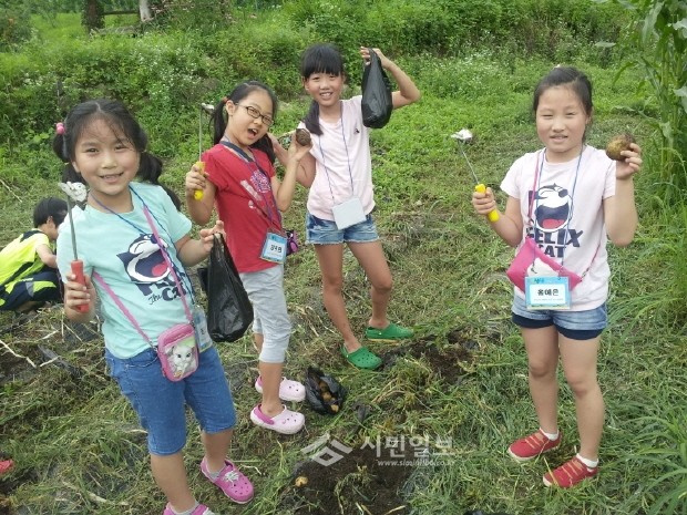 영등포구(구청장 조길형)는 지난 4월부터 매월 1회 지역 내 초등학생들을 대상으로 농촌생태 체험 프로그램인 '토요 생생 체험단'을 운영하고 있다. 사진은 지난 7월 경기도 양평의 보릿고개마을에서 감자캐기 체험을 한 어린이들의 모습.
