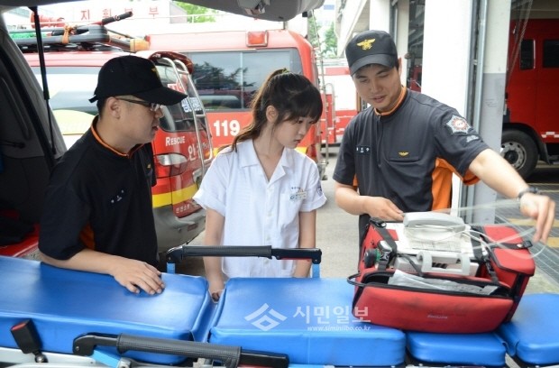 [시민일보]2일 경기 인천남동소방서에서 가천대학교 응급구조학과 2학년 학생 4명이 현장실습 경험을 위해 오는 17일까지 “구급차 동승 현장실습”을 실시한다. 사진은 구급대원에게 장비설명을 듣고있는 가천대학교 응급구조학과 학생의 모습.