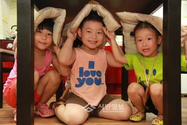 [시민일보]서울 구로소방서는 지난 9일 구로구 고척1동 소재 '예나어린이집' 원생 및 지도교사 등을 대상으로 어린이들이 반드시 알고 있어야 할 소방안전 기본상식을 배울수 있는 ‘119 여름학교 소방대장’ 체험학습을 운영했다. 사진은 아이들이 진도 5도를 가상한 '지진체험'에서 책상 밑에 대피하고있는 모습.