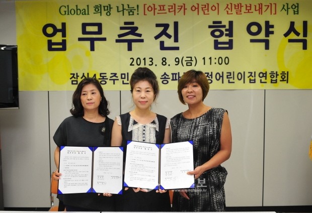 지난 9일 서울 송파구 잠실4동주민센터에서는 송파구가정어린이집 연합회와 함께 'Global 희망 나눔! 헌 옷, 헌 신발이 만드는 행복한 나눔!' 양해각서(MOU)를 체결해 기증받은 헌 옷, 헌 신발을 아프리카 어린이들에게 나누어주는 후원사업을 시작했다. 사진은 협약체결 후 기념촬영을 하는 모습.