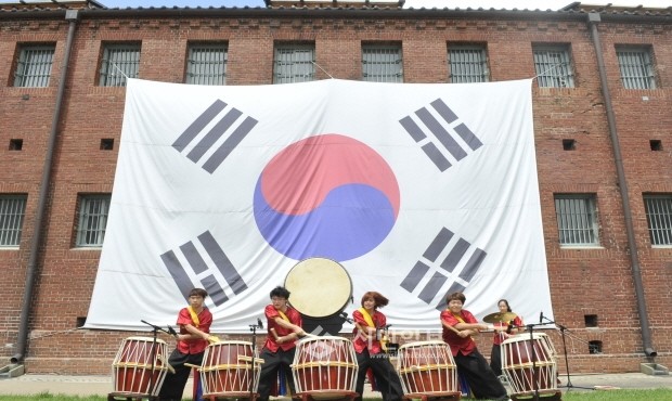 [시민일보]지난 15일 서대문구는 일제강점기 독립운동가들이 고난을 치렀던 서대문형무소역사관에서 제68주년 광복절 기념공연을 펼쳤다. 사진은 대형 태극기가 내걸린 역사관 내 10옥사 앞 잔디마당에서 모듬북 공연이 펼쳐지고 있는 모습.