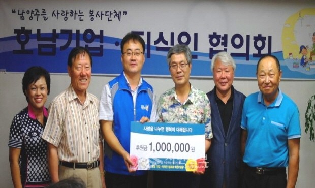 지난 19일 경기 남양주 호남기업 지식인 협의회는 와부읍에 거주하는 홀몸 노인을 돕기위해 백만원의 후원금을 남부희망케어센터에 전달했다. 사진은 후원금 전달식후 기념사진을 촬영하는 모습.