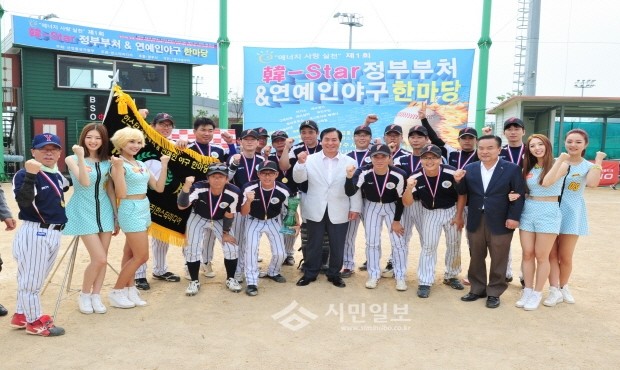 최근 직장인들로 구성된 양주시 꺽정야구단이 ‘제1회 韓-Star 정부부처&연예인 야구대회’에서 우승을 차지했다. 사진은 우승 후 기념촬영하는 꺽정야구단의 모습.